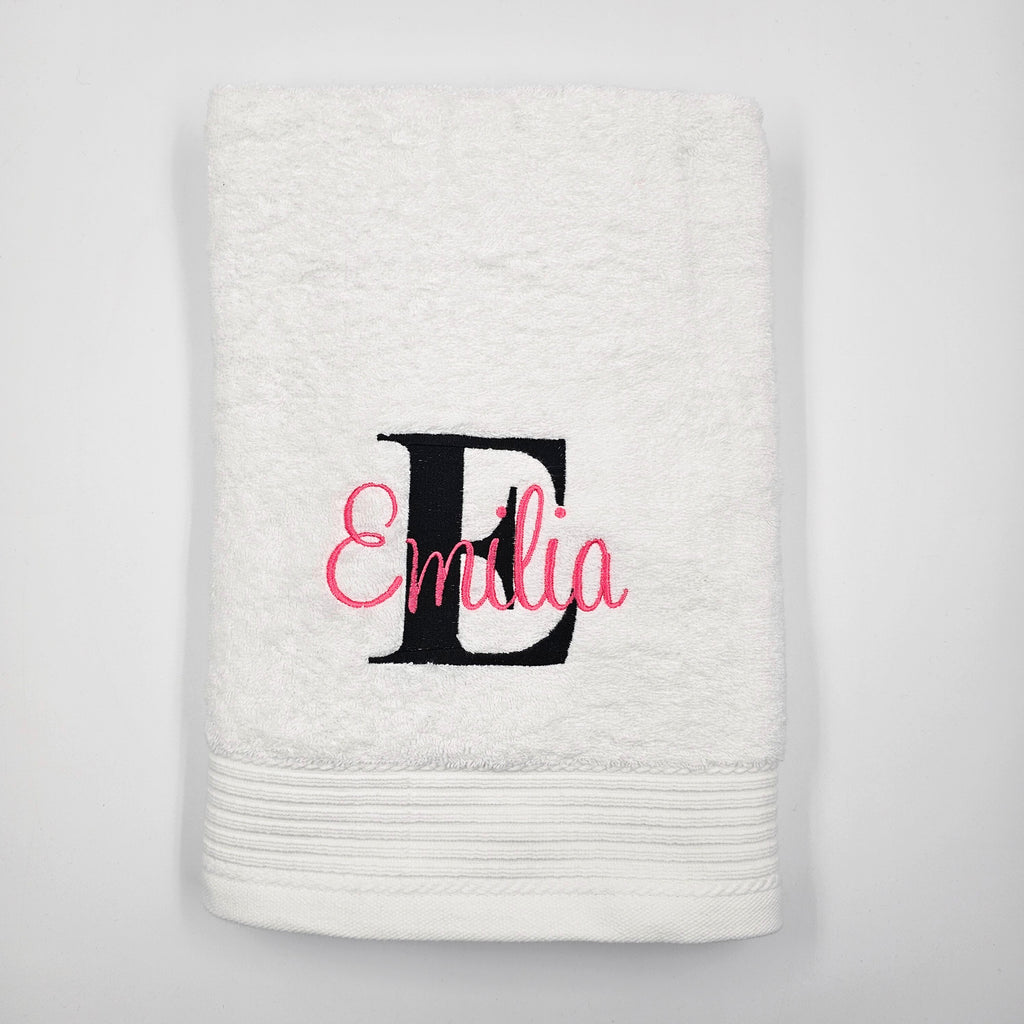 Weißes Handtuch bestickt mit Initial in Grün + Name in Kupfer, dieses Handtuch ist ein ideales Geschenk zur Geburtstag, Taufe oder auch zu deinem Anlass.